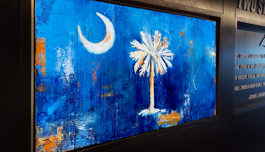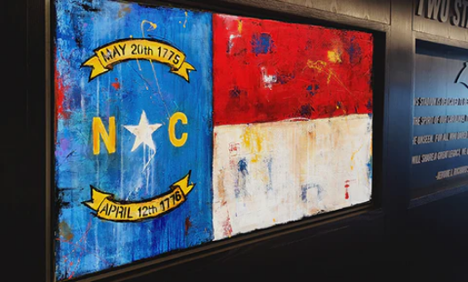 Explore Erin Ashley’s iconic series at the Bank of America Stadium, Charlotte, NC, where her vibrant interpretations of the NC and SC flags captivate visitors. Admire these twelve masterpieces, strategically positioned across the stadium’s exclusive club levels, enriching the ambiance with local heritage and artistic finesse.